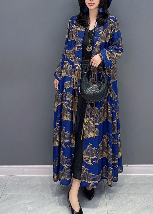 Sexy blauer Peter-Pan-Kragen-Print, schmaler Maxi-Trenchcoat, lange Ärmel, LY4341