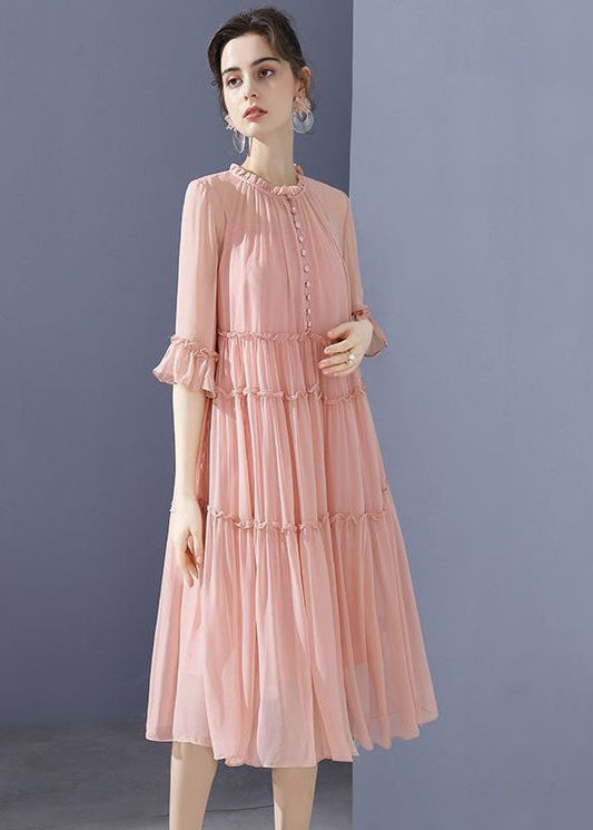 Böhmisches rosa O-Ausschnitt Rüschen Patchwork Seide Midi Kleider Sommer LY4568