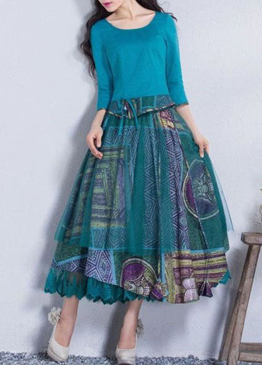 Boutique Grün O Hals Print Patchwork Seide Kleider Sommer LY4558