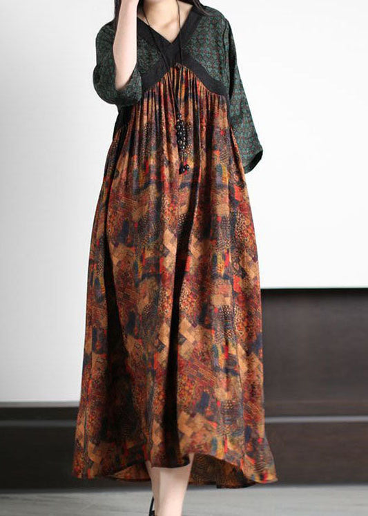 Einzigartiges grünes Seidenkleid mit V-Ausschnitt und Falten-Patchwork-Print für den Sommer LY4559