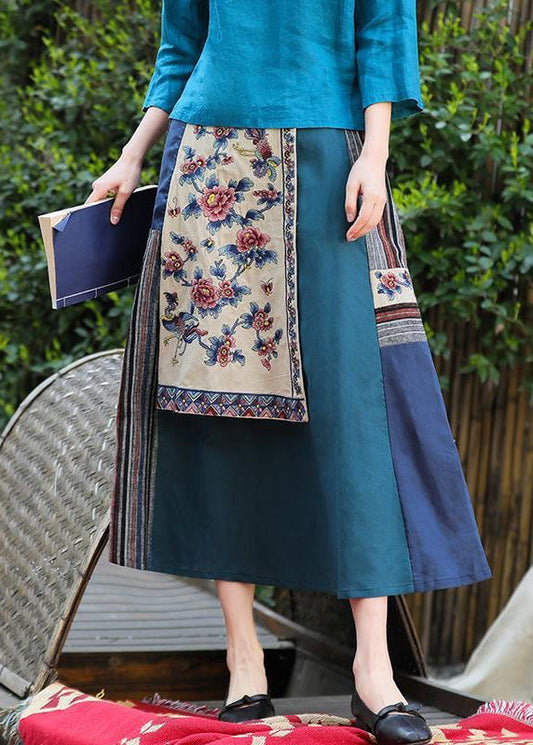 Vintage Blau Falten Bestickte Taschen Patchwork Leinenrock Sommer LY4563