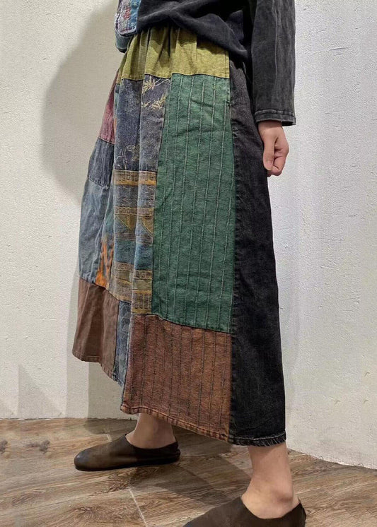Vintage Colorblock Falten Elastische Taille Patchwork Baumwolle Röcke Frühling LY4099