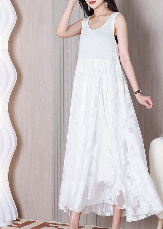 Lässiges weißes O-Ausschnitt Patchwork Spitzen Knöchelkleid ärmellos LY3728