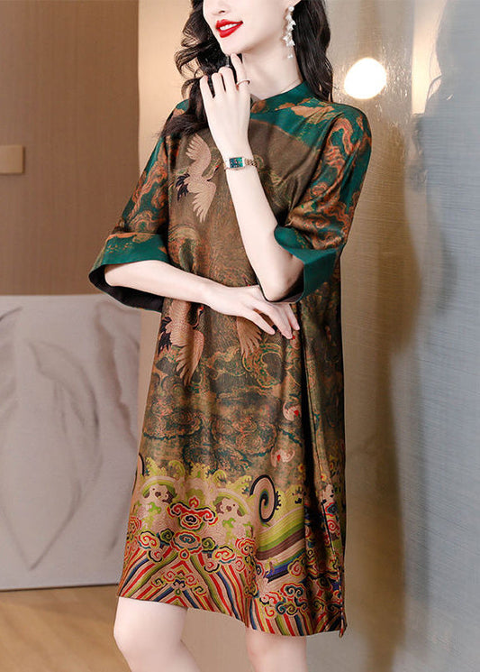Grünes, übergroßes Seidenkleid im chinesischen Stil mit Print und halben Ärmeln für Damen LY3746