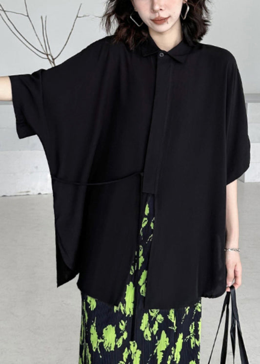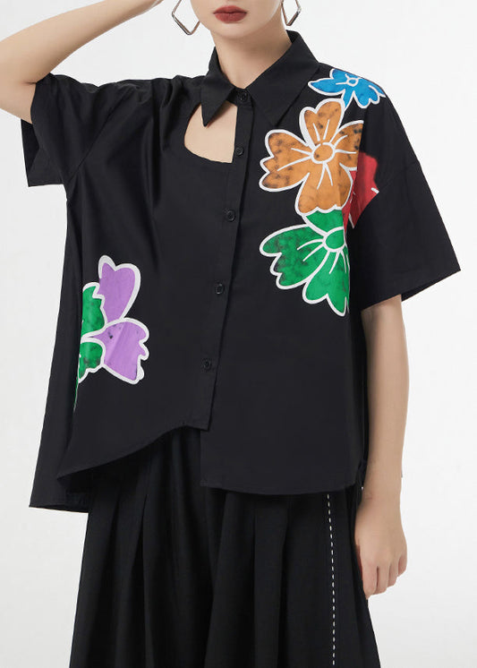 Elegantes schwarzes kurzärmliges Baumwollhemd mit Patchwork-Print und asymmetrischem Print LY9557