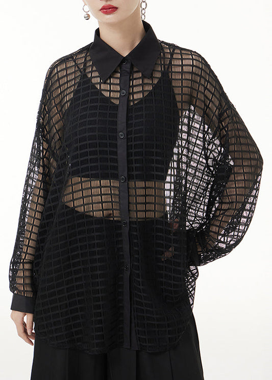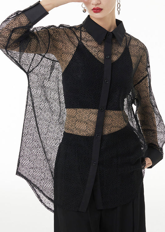 Lockeres schwarzes Peter-Pan-Kragen-Hemd mit ausgehöhltem Patchwork und Spitze, lange Ärmel, LY9556