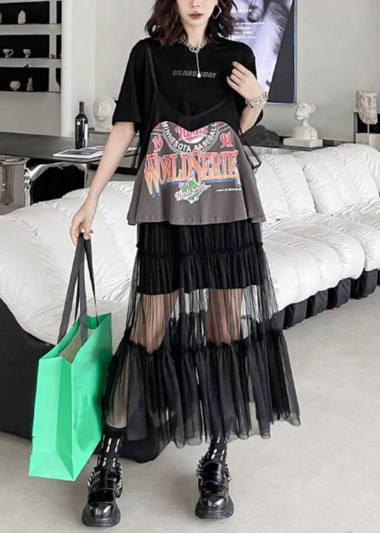 Neues schwarzes zweiteiliges Set mit Rundhalsausschnitt, faltigem Tüll-Patchwork, Sommer LY9555