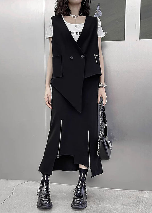 Einzigartiges schwarzes asymmetrisches Patchwork-Set aus Weste und Röcken aus Baumwolle, zweiteilig, ärmellos LY9544