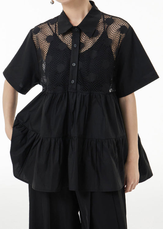 Einzigartige schwarze ausgehöhlte, faltige Patchwork-Baumwollblusen für den Sommer LY9537