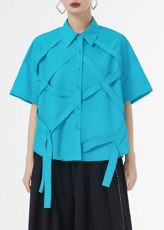 Plus Size Königsblaue Patchwork-Baumwollhemden mit Quastenknöpfen für den Sommer LY9551