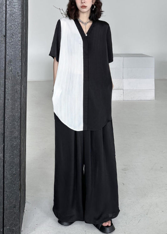 Damen Schwarz V-Ausschnitt Asymmetrisch Patchwork Baumwolle Zweiteiler Sommer LY9559