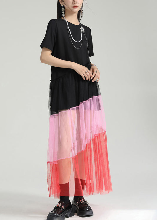 Mode Colorblock O Hals Faltig Patchwork Tüll Kleider Sommer LY9475