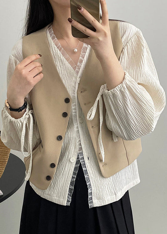Einfaches, vielseitiges, khakifarbenes, ärmelloses Weste-Top mit V-Ausschnitt und Knöpfen WD009
