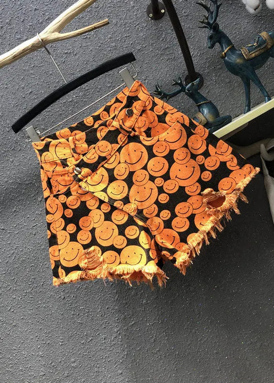Feine orangefarbene Patchwork-Jeansshorts mit weitem Bein im Print, Sommer ML0708