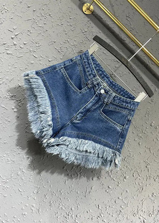 Damen Shorts mit zerrissenem Saum und Perlenbesatz in Blau LY7922