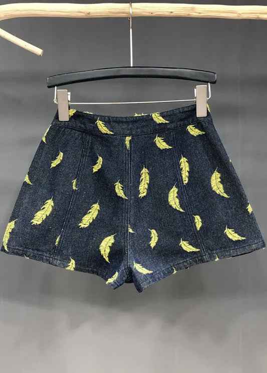 Stilvolle Marineblaue Patchwork-Jeansshorts mit bestickten Federn für den Sommer ML0756