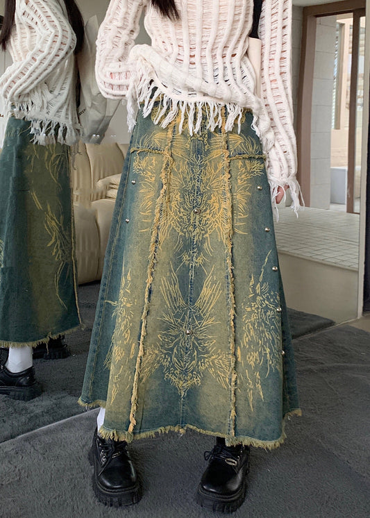 Französische blaue Loch-Maxiröcke aus Denim mit hoher Taille, Sommer AW1014