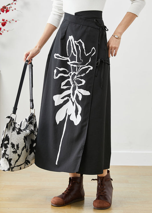 Lässiger schwarzer asymmetrischer Baumwollrock mit Schnürung und Print, Herbst LY9879