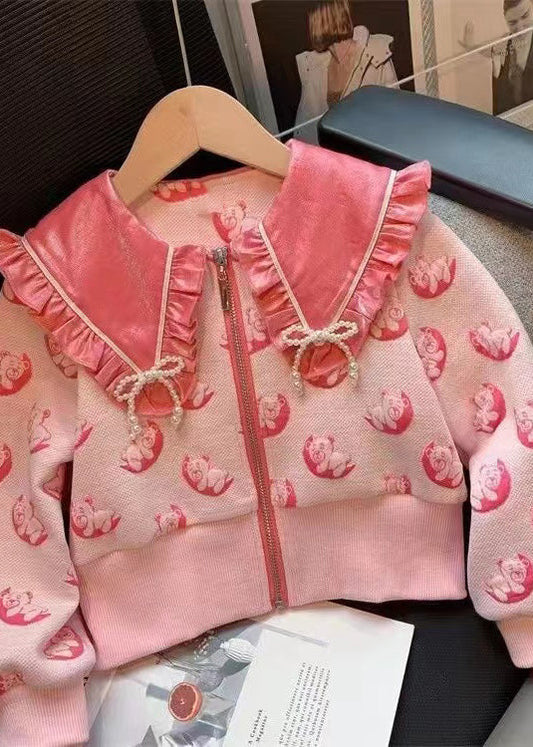 Süßes rosa Rüschen-Print-Top und Röcke aus Baumwolle für Kinder, Mädchen, zweiteilig, Herbst LY9944