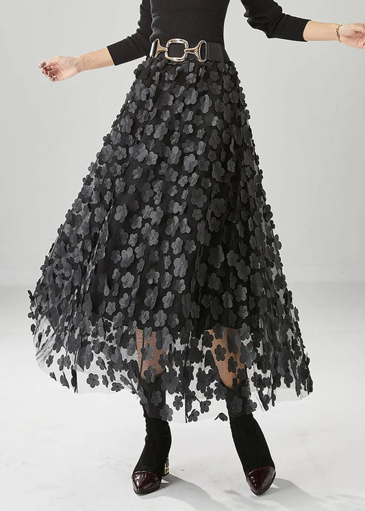 Handgemachte schwarze Tüllröcke mit Blumenapplikationen in A-Linie, Herbst ML0484