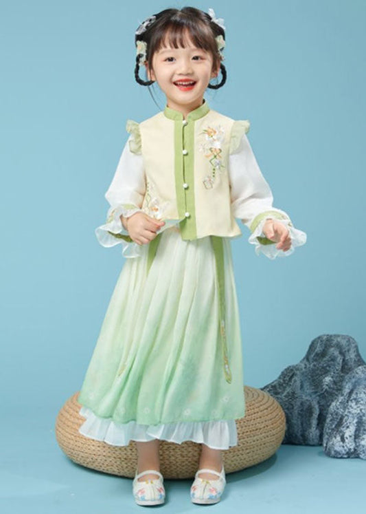Schönes, gelbgrünes, besticktes Kinder-Top und Maxiröcke mit Stehkragen, zweiteiliges Set für den Herbst ML0189
