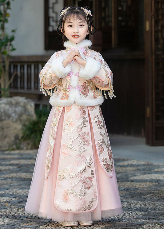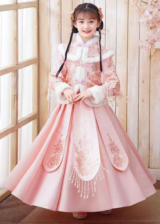 Stil Rosa Bestickte Warme Fleece Mädchen Mäntel Und Tüll Maxi Röcke Zwei Stücke Set Langarm ML0166