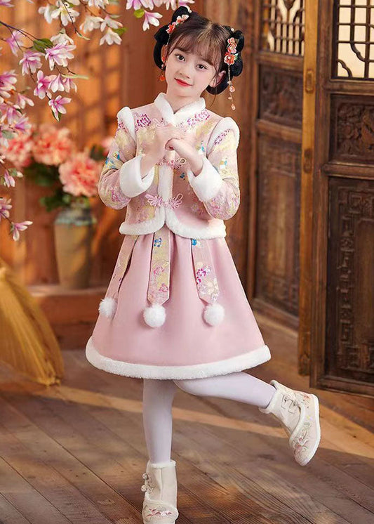 Rosa Patchwork Warme Fleece Kinder Mäntel Und Maxi Röcke Zwei Stück Set Winter ML0158