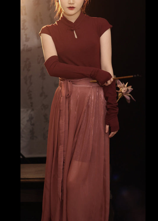 Schönes rotes Stehkragen-Knopfoberteil und Maxiröcke, zweiteiliges Set, Frühling LY2663