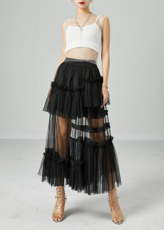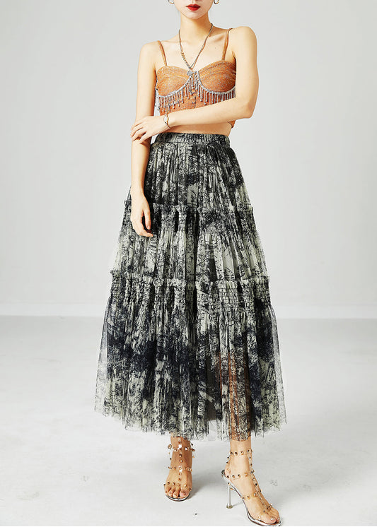 Italienischer schwarzer Tüllrock mit elastischer Taille und Batikmuster, faltig, Sommer LY2421