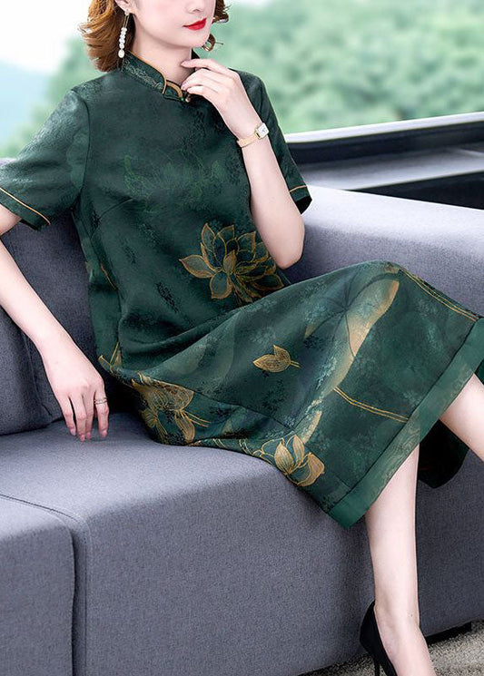 Grüner Seidenrock mit Lotus-Print und Stehkragen in A-Linie für den Sommer LY2240