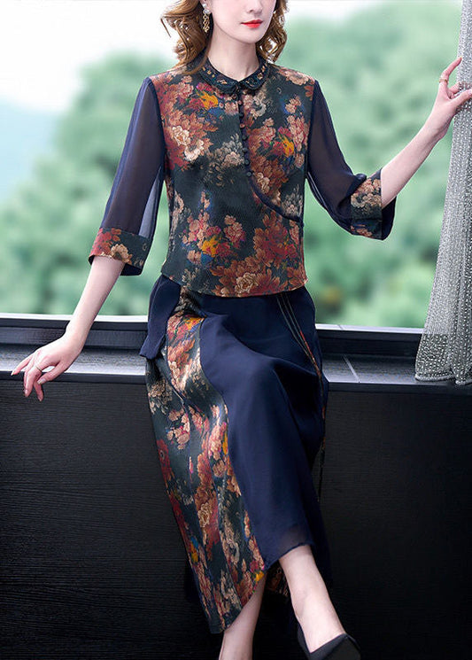 Moderne blaue Seidentops und -röcke mit Patchwork-Print, Sommer-Outfits LY2229