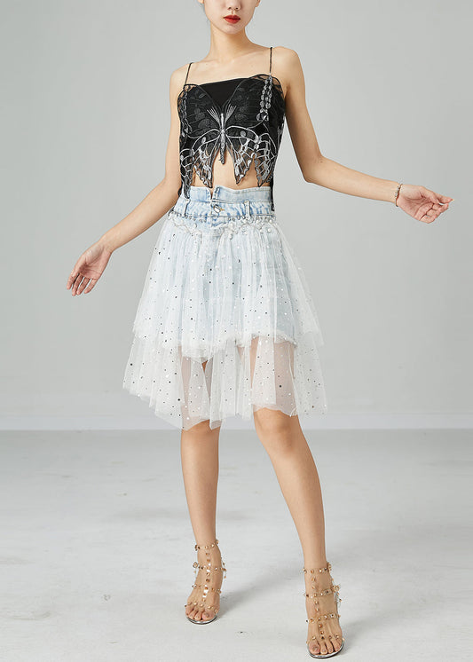 Frauen Hellblau Elastische Taille Tüll Patchwork Denim Röcke Sommer LY2439