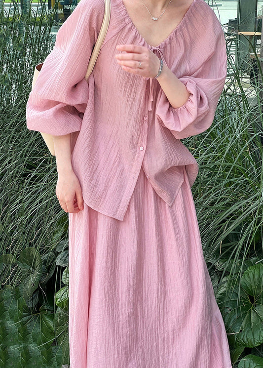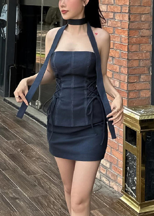 Sexy Beige V-Ausschnitt Schnür-Tank und Röcke Baumwolle Zweiteiler Set Ärmellos YZ060