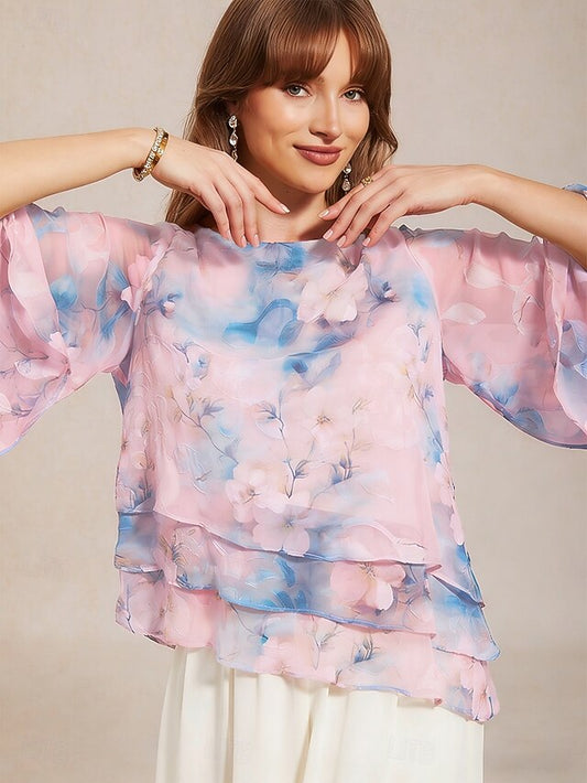 Women's Sheer Blouse Chiffon Tops Layered Floral Elegant