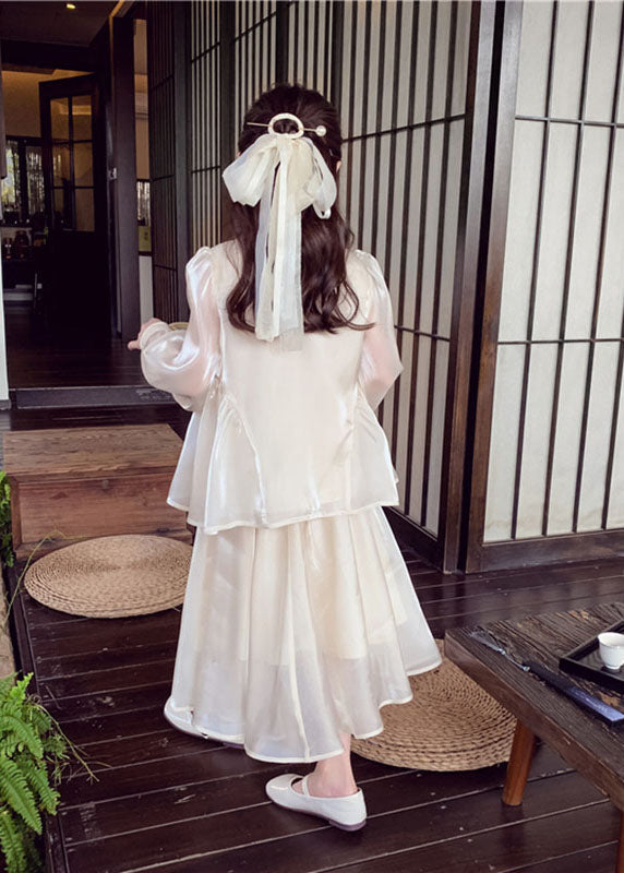 Kunst Apricot Pailletten Knopf Seide Kinder Shirts und Maxi Röcke zwei Stücke Set Frühling