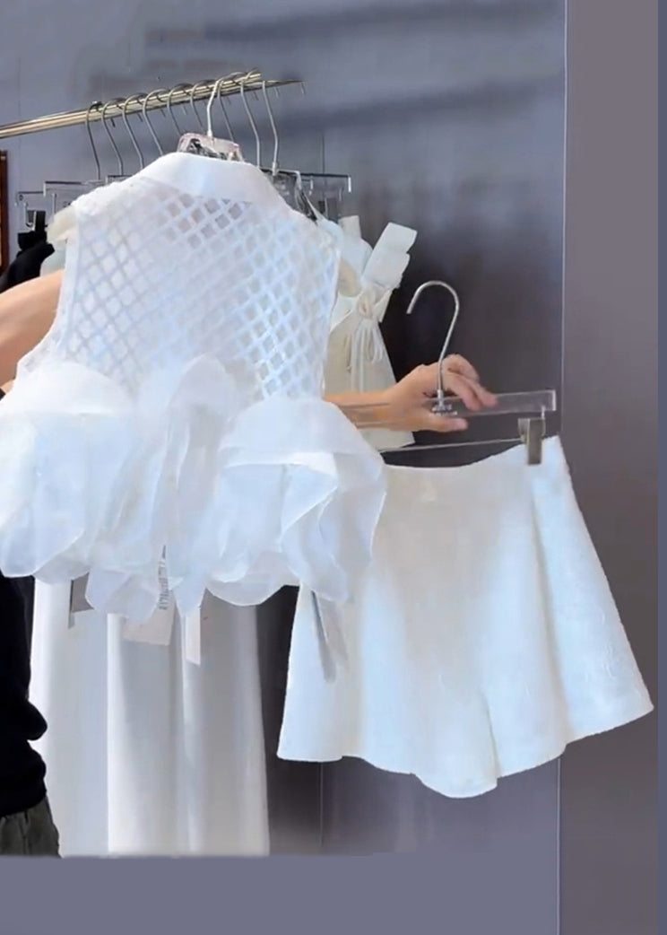 Stylish White Peter Pan Collar Plaid Shirts And Shorts Cotton Two Piece Set Sleeveless