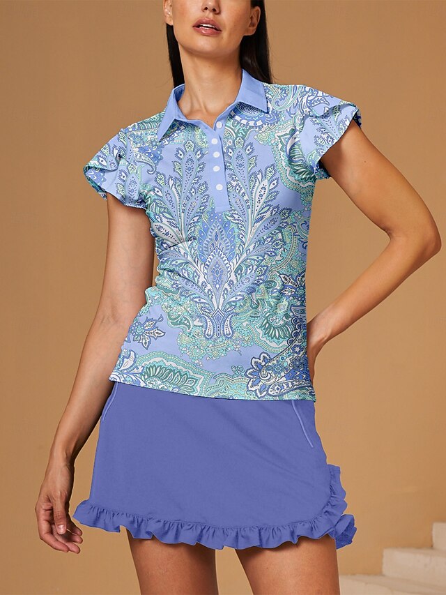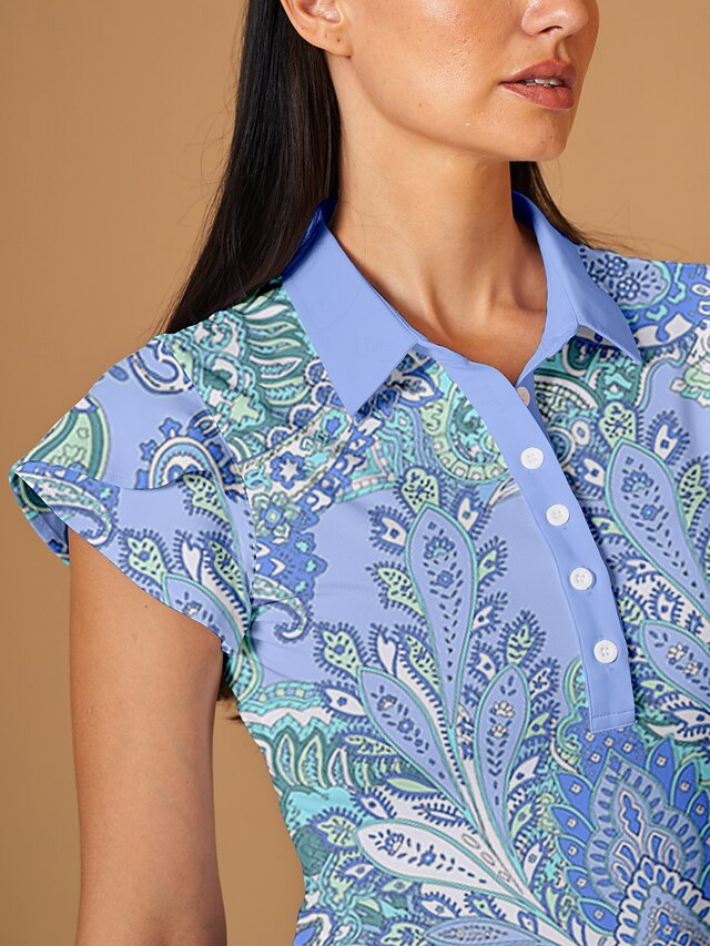 Gender: Women's, Age Group: Adults', Sports Clothing Sub Category: Golf Polo Shirt, Clothing Type: Top, Activity: Golf, Tennis, Pickleball, Occasion: Sports, Athleisure, Season: Summer, Fit Type: Regular Fit, Elasticity: High Elasticity, Function: Soft, Breathable, Moisture Wicking, Fabric: Spandex, 21 GRAMS Airful 2.0 Fabric, Polyester, Sleeve Length: Short Sleeve, Design: Ruffle, Buttons, Pattern: Paisley, Look After Me: Wet and Dry Cleaning, Washable,