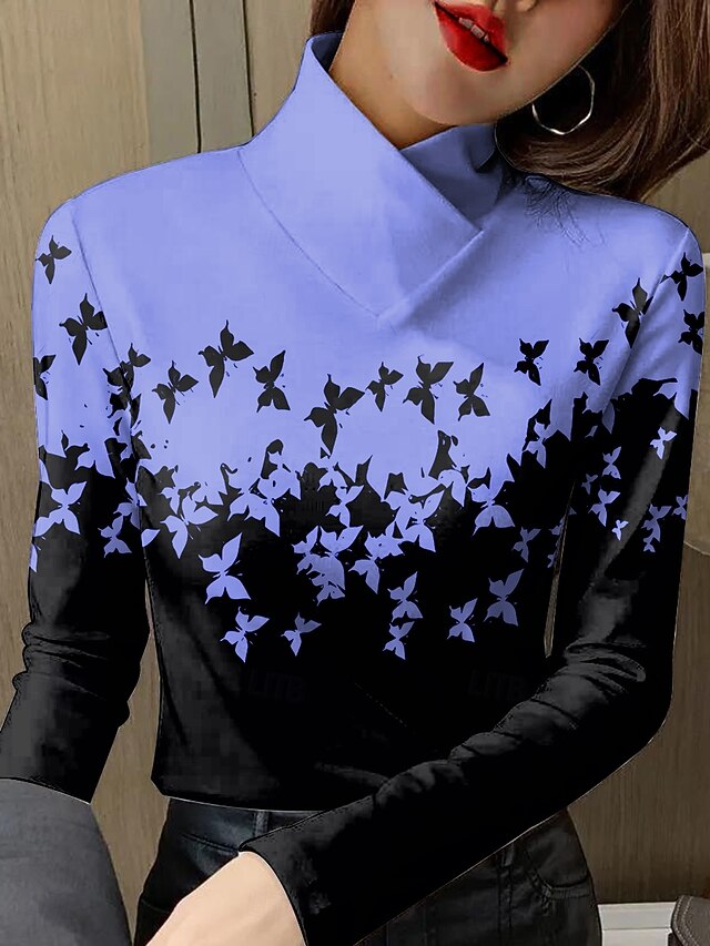 Tops Type: T Shirt, Fabric: Polyester, Gender: Women's, Design: Print, Occasion: Daily, Style: Vintage, Elegant, Trendy, Casual, Stylish, Classic, Category: Long Sleeve T-shirt, Fit Type: Form Fit, Neckline: High Neck, Asymmetric Neck, Sleeve Length: Long Sleeve, Elasticity: Micro-elastic, Look After Me: Washable, Hand wash, Machine wash, Top Length: Regular Tops, Pattern: Graphic, Butterfly, Season: Spring, Winter, Fall,