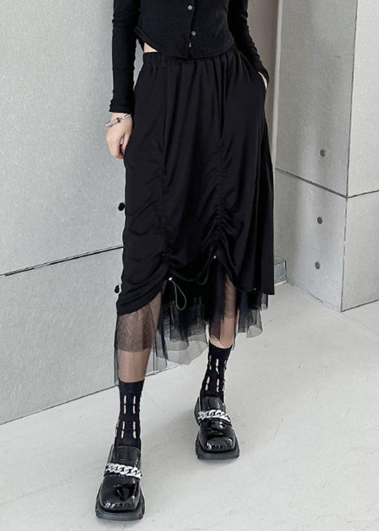 Jupe patchwork en tulle à taille élastique avec cordon de serrage pour femme, noire, été, LY9378