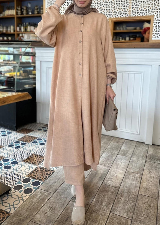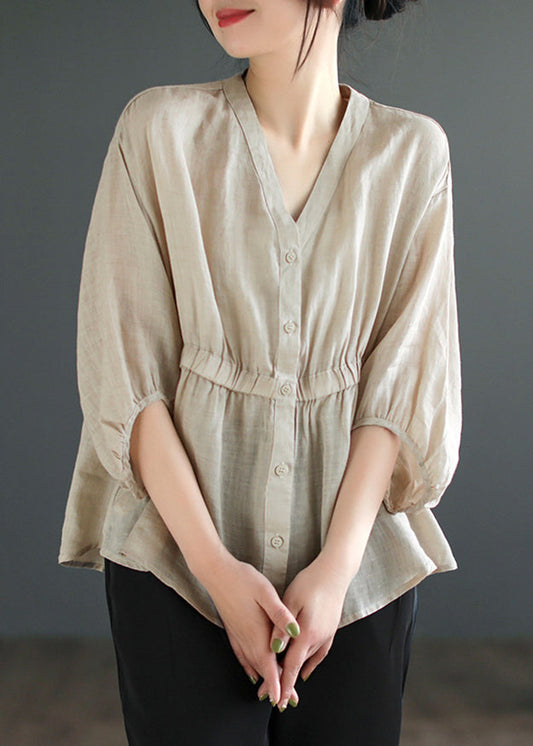Chemisiers en lin à boutons et col en V de couleur camel clair grande taille pour l'été ML2351