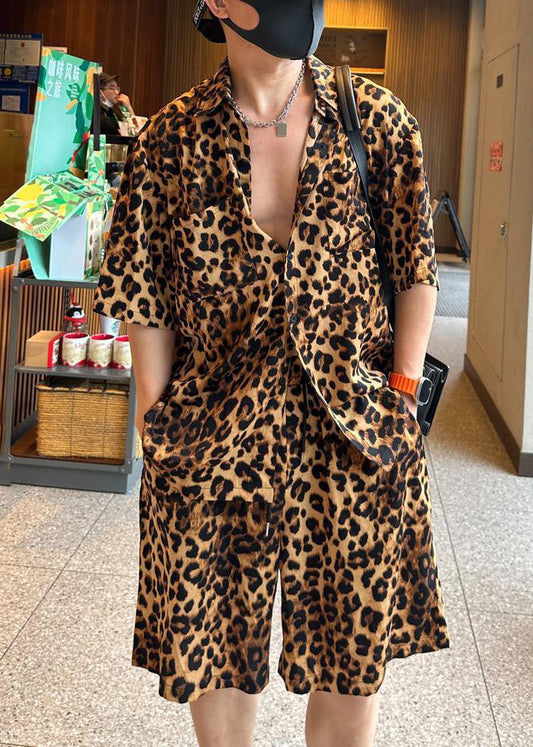 Ensemble deux pièces en coton pour homme, grande taille, col Peter Pan, poches, léopard, été HG053