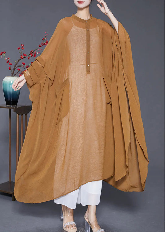 Blouse longue kaki surdimensionnée en mousseline de soie froissée UPF 50+ grande taille pour l'été LY8717