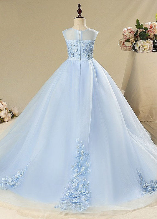 Robe longue élégante en tulle bleu à fleurs et papillons pour enfants, sans manches, YS008