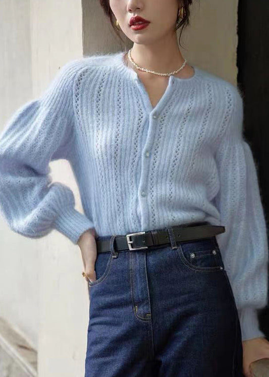 Pull élégant à manches lanternes et boutons bleus ajourés Ma Hai Mao TU039