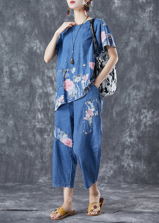 Ensemble deux pièces en denim bleu élégant à imprimé patchwork asymétrique Printemps LY5693