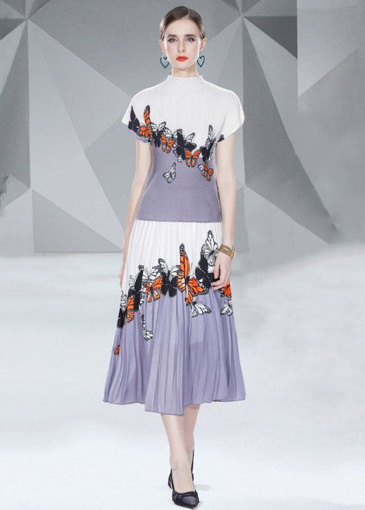 Ensemble deux pièces élégant en coton avec haut et jupe à imprimé papillon bleu pour l'été LY7451