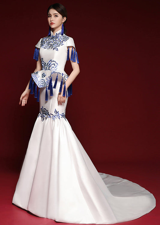 Robe longue brodée à pampilles en porcelaine bleue et blanche élégante à manches courtes ML1544
