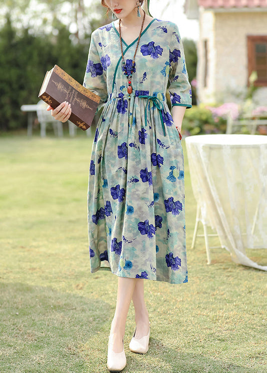 Robe d'été élégante en coton bleu avec col en V et poches imprimées KJ009