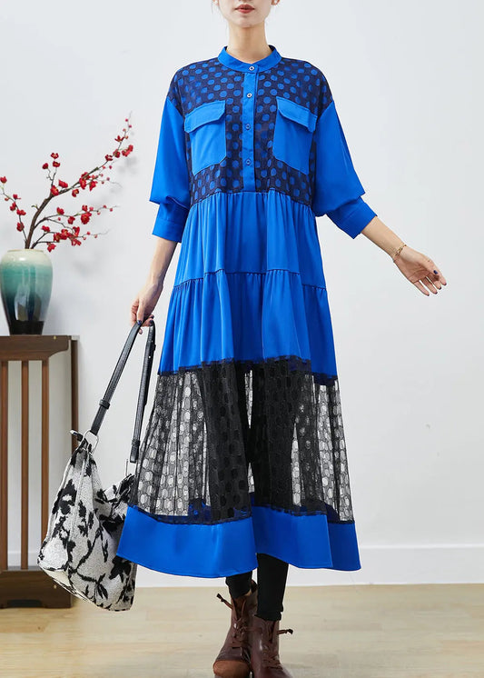 Robe élégante en coton à col montant et patchwork de dentelle bleue pour l'automne ML3205