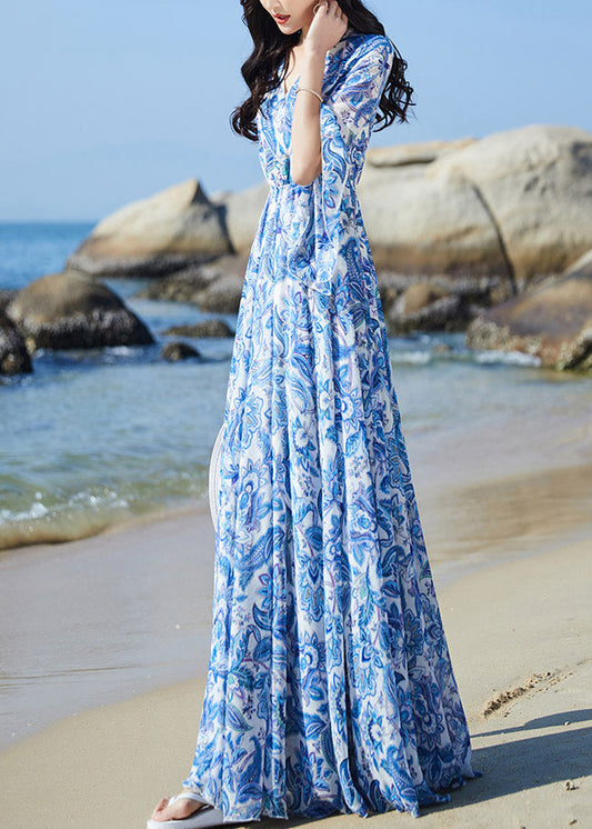 Robe longue de vacances en mousseline de soie à taille élastique et col en V bleu élégant à manches évasées LY1697